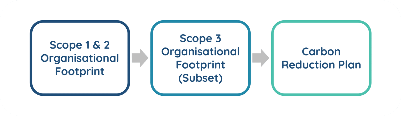 After completing a Scope 1 and 2 footprint and then the Scope 3 subset, a carbon reduction plan (CRP) can now be developed. As of April 2024, this plan needs to cover Scope 1 & 2, as well as the initial subset of Scope 3 emissions mentioned. From April 2027, it will subsequently need to cover all Scope 1, 2 and 3 emissions.