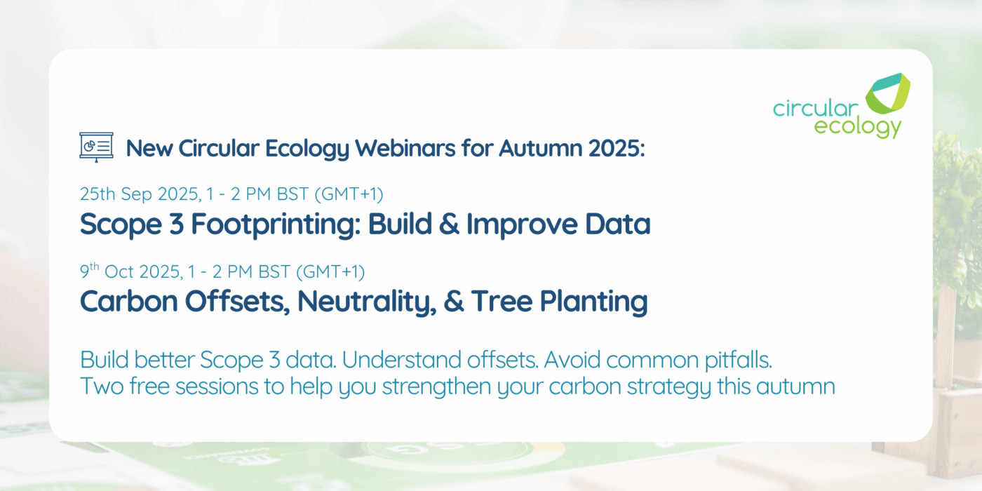 Circular Ecology are pleased to announce two upcoming free webinars, offering practical guidance on two key sustainability topics: Organisational Carbon Footprinting and Bespoke Carbon Datasets. Organisations seeking to strengthen their carbon reporting, improve data quality, or better understand advanced carbon datasets are invited to join us for these expert led sessions. Each webinar includes time […]