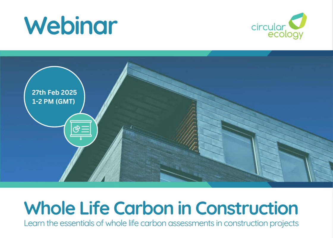 Join Circular Ecology for a webinar on Whole Life Carbon Assessments (WLCA) in Construction Circular Ecology invites you to a free upcoming webinar on the 27th of February, where we will provide a clear and practical overview of WLCA in Construction. What will this webinar cover? What is embodied carbon? What is a whole life […]