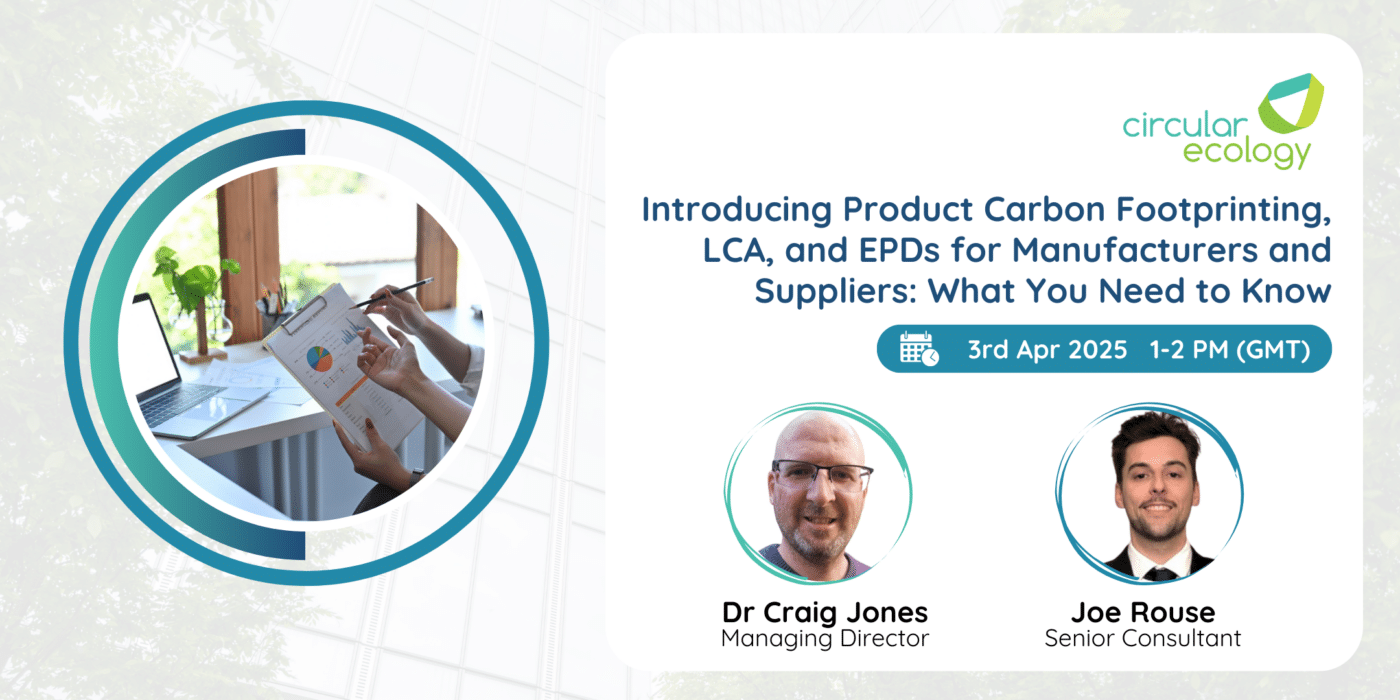 On Wednesday, April 3rd, Circular Ecology delivered our fourth webinar of 2025: Product Carbon Footprinting, LCA, and EPDs for Manufacturers and Suppliers: What You Need to Know In this session, our speakers – Dr Craig Jones, Managing Director, and Joe Rouse, Senior Consultant – explored the fundamentals of product level carbon assessments and their role in […]