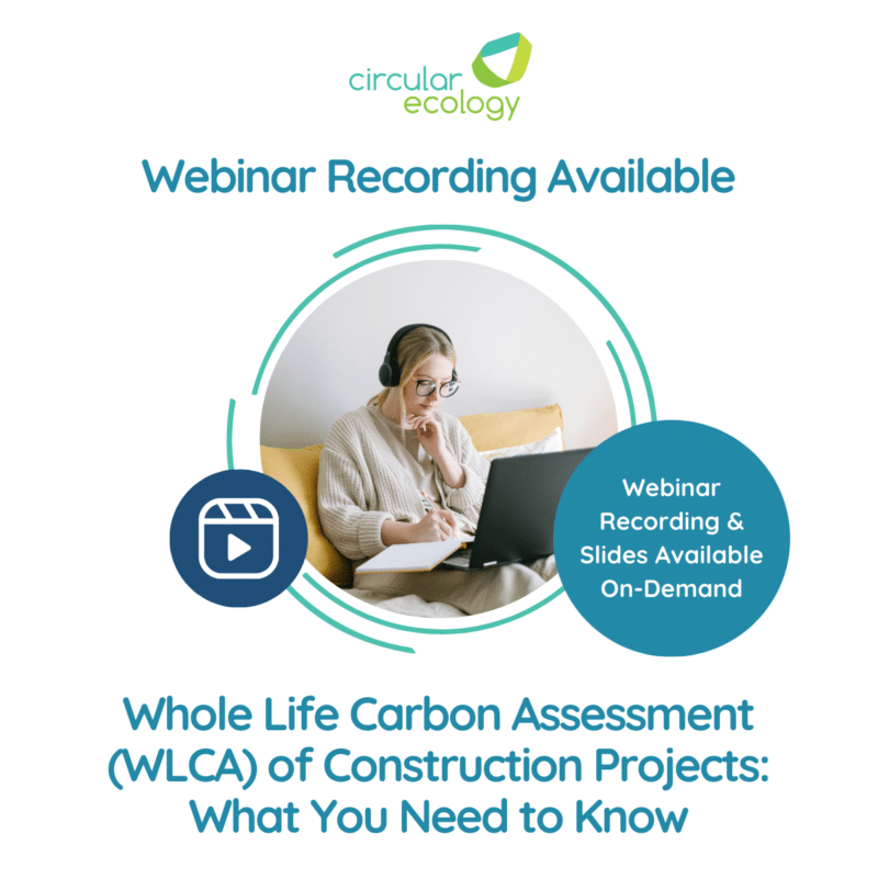 On February 27th, Circular Ecology hosted another free webinar. This time, the topic focused on the Whole Life Carbon Assessment (WLCA) of Construction Projects. Led by Dr Craig Jones, Managing Director, and Edwin Lowe, Delivery Manager, the session introduced WLCA and embodied carbon in buildings. Throughout the webinar, we addressed some key questions: What is embodied […]