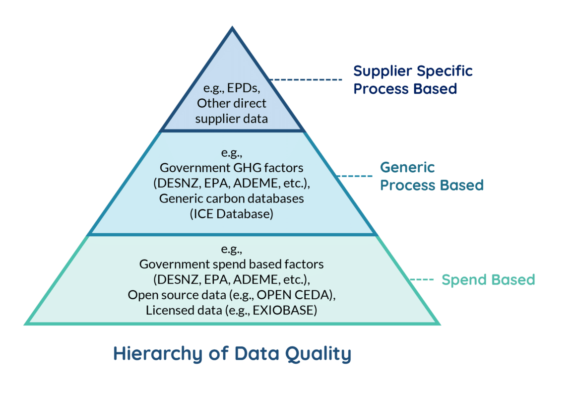 Spend based factors typically sit at the bottom of this hierarchy, followed next by generic process based factors, then more targeted proxy data, and ultimately supplier specific emissions information such as Environmental Product Declarations (EPDs) or verified carbon footprints. In practice, organisations can often use a mix of factor types across their Scope 3 inventory, with higher quality data applied to the most significant categories.